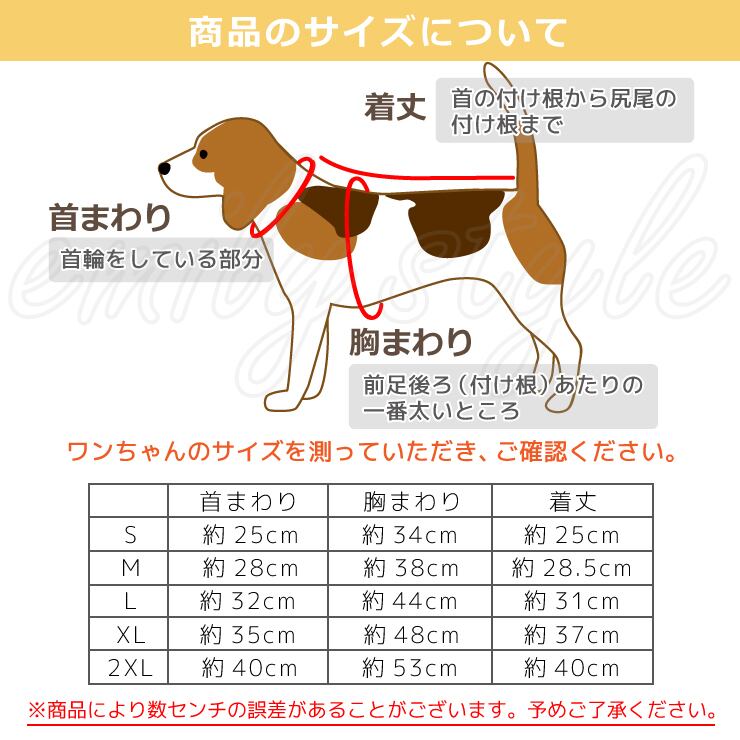 犬種や体重よりも、個々の採寸を重視して余裕をもってお買い求めください。