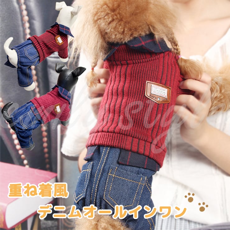 重ね着風 デニムオールインワン サロペット カバーオール つなぎ ペット ウェア 犬 ドッグ 服 袖あり オールインワン ズボン デニム チェックシャツ 女の子 男の子 エミリースタイル emilystyle | emilystyle エミリースタイル ペットグッズ&かわいい雑貨のお店